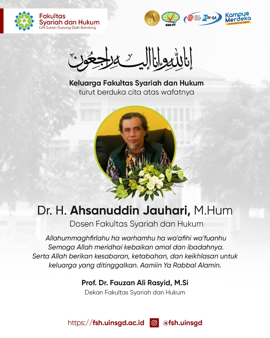 Keluarga Besar Fakultas Syariah dan Hukum turut berduka cita atas wafatnya Dr. Ahsanuddin Jauhari, M.Hum. husnul khatimah diterima amal ibadahnya ditempatkan di surga yang mulia di sisi Alloh SWT. Amin YRA