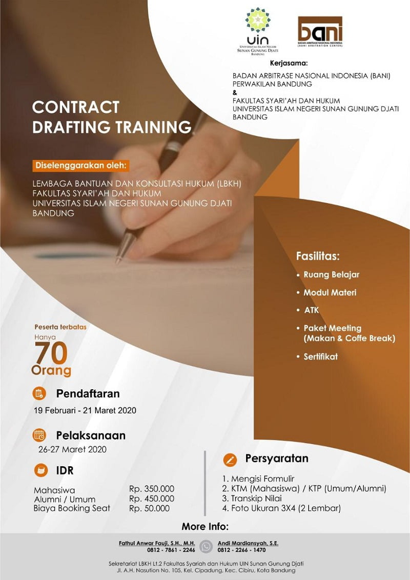 Hal itu diungkapkan oleh Ketua Lembaga Bantuan dan Konsultasi Hukum (LBKH), Fakultas Syari’ah dan Hukum UIN Sunan Gunung Djati Bandung E Hasbi Nassaruddin, SH, MH, di ruang kerjanya Jl AH Nasution NO 105 Bandung, Selasa (03/03/2020). Untuk kepentingan itu, LBKH FSH akan menggelar Contract drafting training selama dua hari, 26-27 Maret 2020.