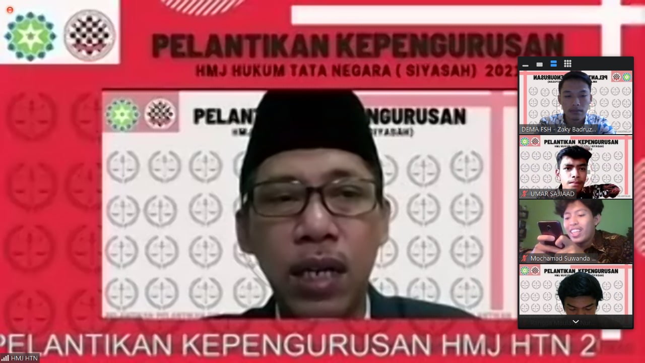 Wakil Dekan III Fakultas Syariah dan Hukum (FSH), Dr H Aden Rosadi M Ag.,CLA membuka acara Pelantikan Pengurus Himpunan Mahasiswa Jurusan (HMJ) Hukum Tata Negara (HTN) yang dilakukan secara virtual, Jumat (7/5/2021).